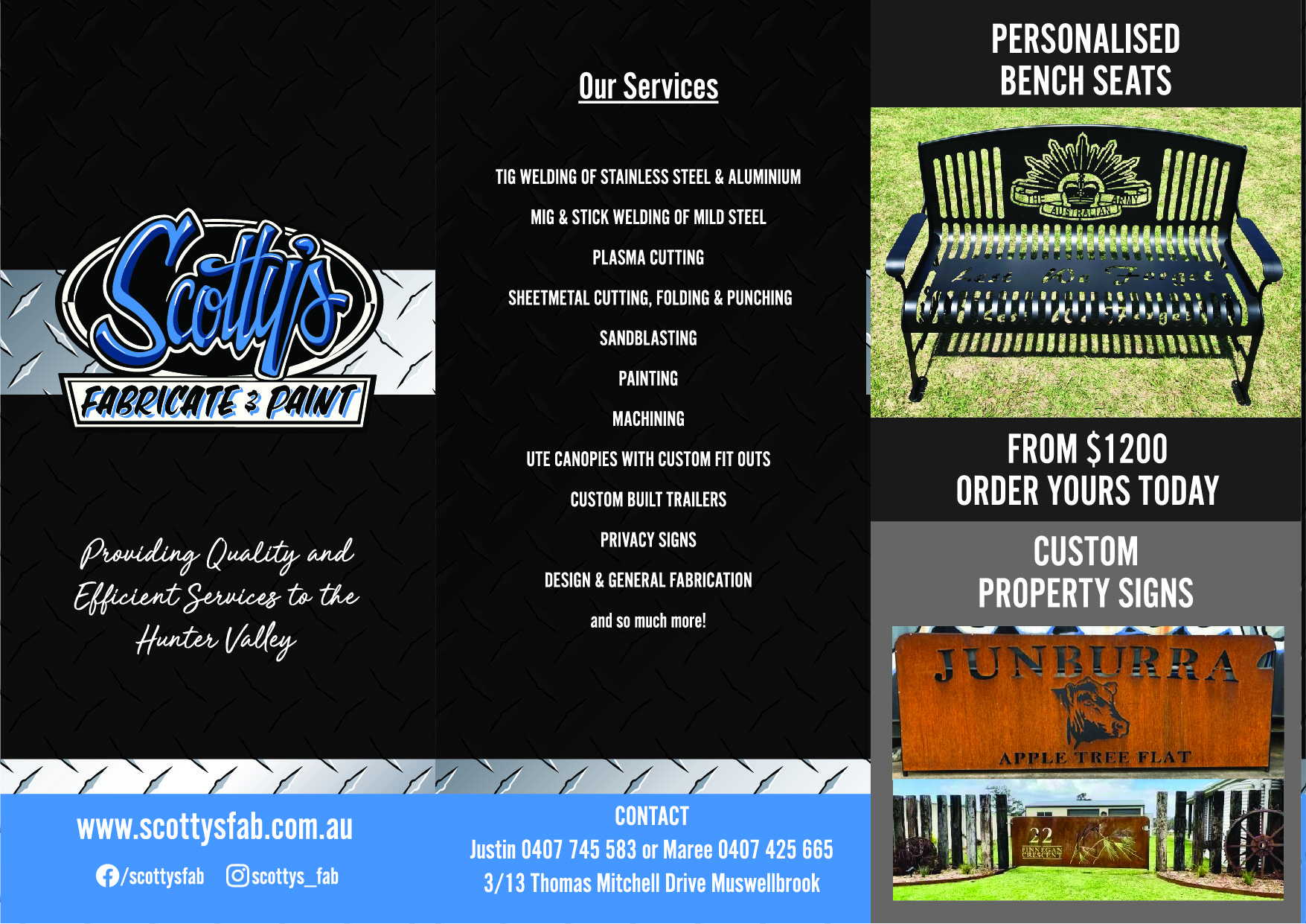 Here at Scotty’s Fab we also have designed these beautiful keepsake bench seats. Birthdays, anniversaries, memorials, any occasion to delight your loved ones. Priced from $1200 (Customer to organise delivery at their own cost).